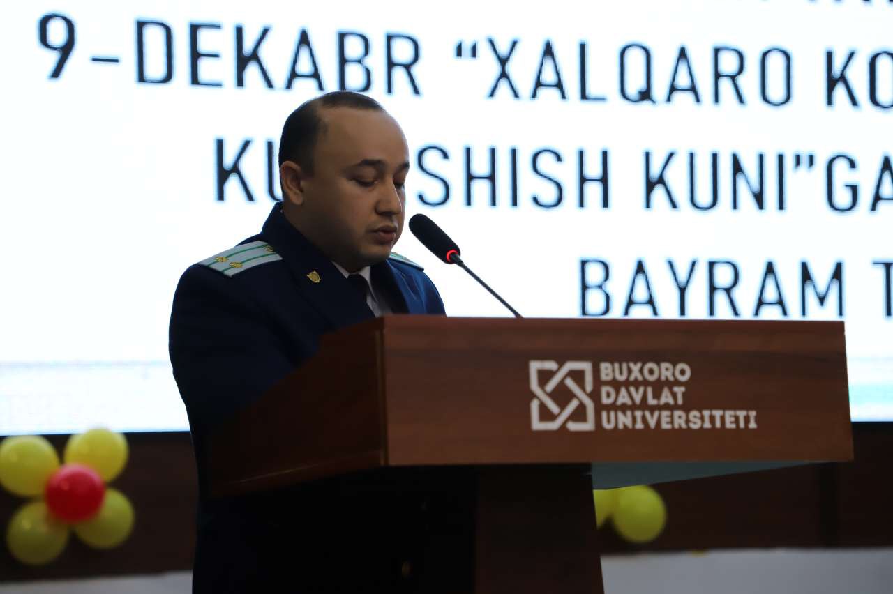BuxDU Pedagogik ta'lim fakulteti tomonidan 9-dekabr - Xalqaro Korrupsiyaga qarshi kurashish kuni munosabati bilan "Korrupsiyada talabalar ishtiroki" mavzusida tadbir bo'lib o'tdi. Tadbirda O'zbekiston Respublikasi prokuraturasi huzuridagi departamentning Buxoro viloyati boshqarmasidagi bo'lim boshlig'i Adliya maslahatchisi N. H.Po'latov Buxoro shahar IIO FMB XPB VEMB katta inspektor-psixolog podpolkovnik N.S. Abzalovalar qatnashdilar.