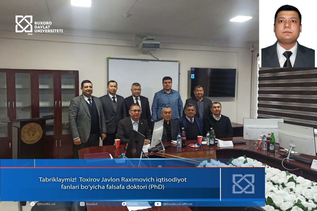 Toxirov Javlon Raximovich Berdaq nomidagi Qoraqalpoq davlat universiteti huzuridagi ilmiy darajalar beruvchi PhD.03/30.01.2020.I.20.06 raqamli ilmiy kengashda "Ta’lim xizmatlari sifatini oshirishda davlat-xususiy sheriklikning tashkiliy-iqtisodiy mexanizmlarini shakllantirish" mavzusidagi 08.00.05 – "Xizmat ko‘rsatish tarmoqlari iqtisodiyoti" ixtisosligida iqtisodiyot fanlari bo‘yicha falsafa doktori (PhD) dissertatsiyasini muvaffaqiyatli himoya qildilar.