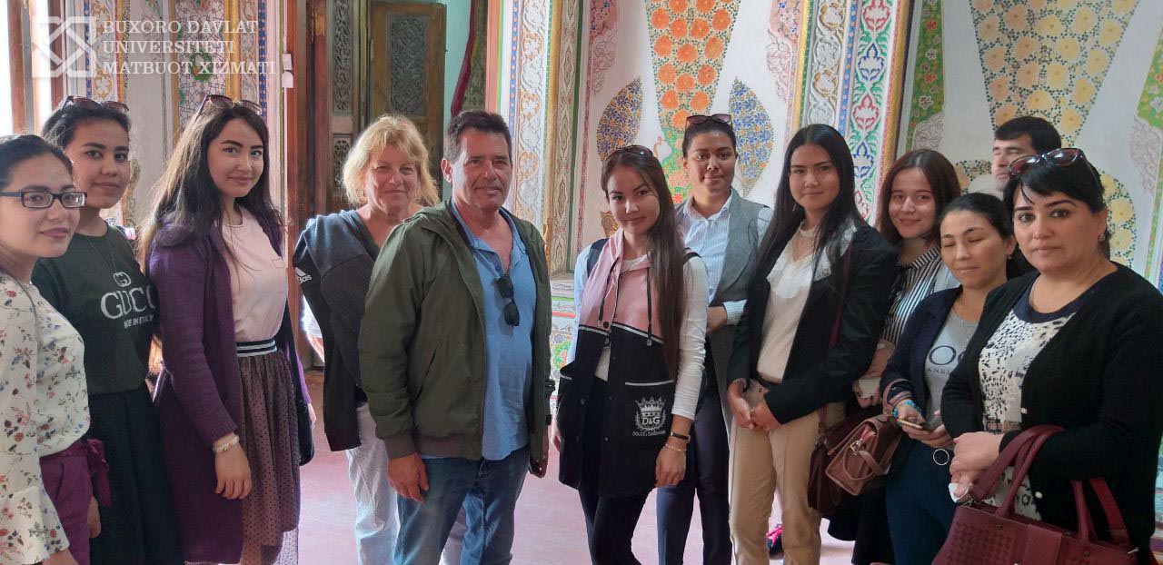 Buxoro davlat universiteti Xorijiy tillar fakulteti Ingliz tilshunosligi kafedrasi malakaviy amaliyot rahbarlari 1 - kurs talabalari bilan birgalikda amaliyot davrida ko'hna va maftunkor Buxoro shahrining qadim yodgorliklarini yana bir bor kashf etmoqdalar. Amaliyot davri ilm- ma'rifatga chanqoq talaba yoshlar uchun qizg'in uchrashuvlarga boy va maroqli o'tmoqda! Talabalar mashg'ulotlardan olgan tinglash-gapirish kabi og'zaki nutq ko'nikmalarini xorijdan kelgan ingliz tili egalari bilan muloqot chog'ida yanada mustahkamlash imkoniga ega bo'ldilar.