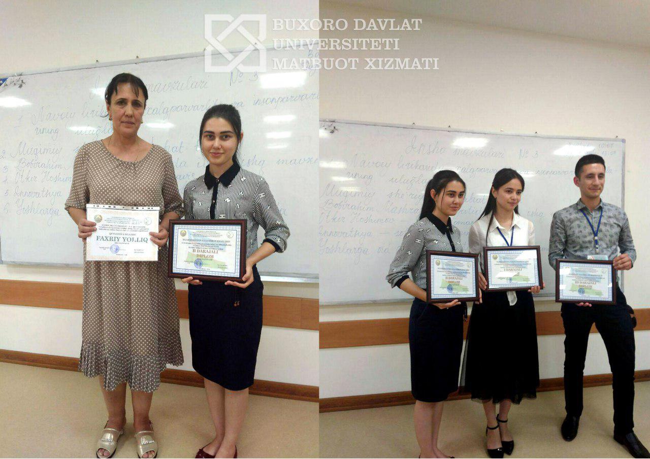 Buxoro davlat universiteti Filologiya fakulteti 5120100 – filologiya va tillarni o‘qitish (o‘zbek tili) yo‘nalishi IV-bosqich talabasi Gulchiroy Egamberdiyevani o‘zbek tili va adabiyoti fani bo‘yicha olimpiadaning Respublika bosqichida sovrinli 2-o‘rinni egallaganligi bilan samimiy qutlaymiz. Talabaning Respublika fan olimpiadasida muvaffaqiyat qozonishiga o‘z hissasini qo‘shgan ilmiy rahbari – professor Dilrabo Habibovna Quvvatovani, guruh rahbari – professor Darmon Saidaxmedovna O‘rayevani, fakultet jamoasi va barcha professor-o‘qituvchilarni qizg‘in tabriklaymiz hamda ilmiy-pedagogik faoliyatlariga ijodiy zafarlar tilaymiz.