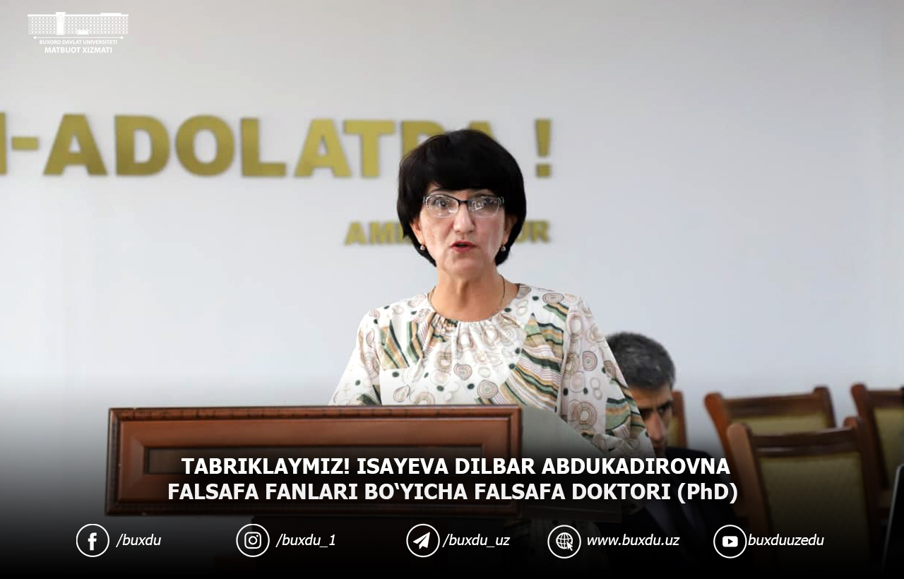 TABRIKLAYMIZ! ISAYEVA DILBAR ABDUKADIROVNA FALSAFA FANLARI BO‘YICHA FALSAFA DOKTORI (PhD)
