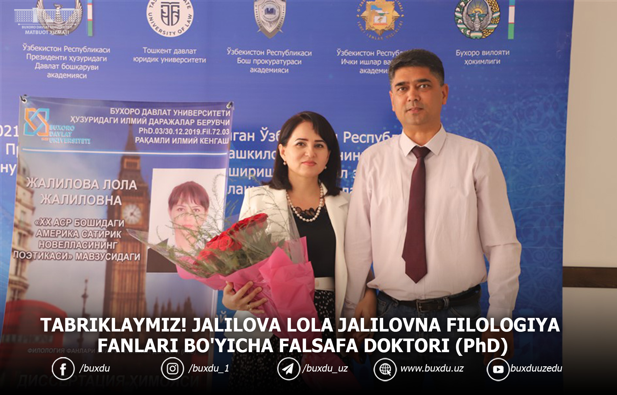 2021 yil 20-may kuni Buxoro davlat universiteti izlanuvchisi Jalilova Lola Jalilovnaning "XX asr boshidagi Amerika satirik novellasining poetikasi" mavzusidagi 10.00.04 - Yevropa, Amerika va Avstraliya xalqlari tili va adabiyoti ixtisosligidagi filologiya fanlari doktori, professor Лиходзиэвский Анатолий Степанович rahbarligida Buxoro davlat universiteti huzuridagi ilmiy darajalar beruvchi PhD.03/30.12.2019.FIL.72.03 raqamli ilmiy kengashda Filologiya fanlari bo’yicha falsafa doktori (PhD) dissertatsiyasini muvaffaqiyatli himoya qildilar. Jamoamiz nomidan samimiy tabriklaymiz. Keyingi ilmiy-ijodiy ishlariga barkamollik tilaymiz!BuxDU Matbuot xizmati