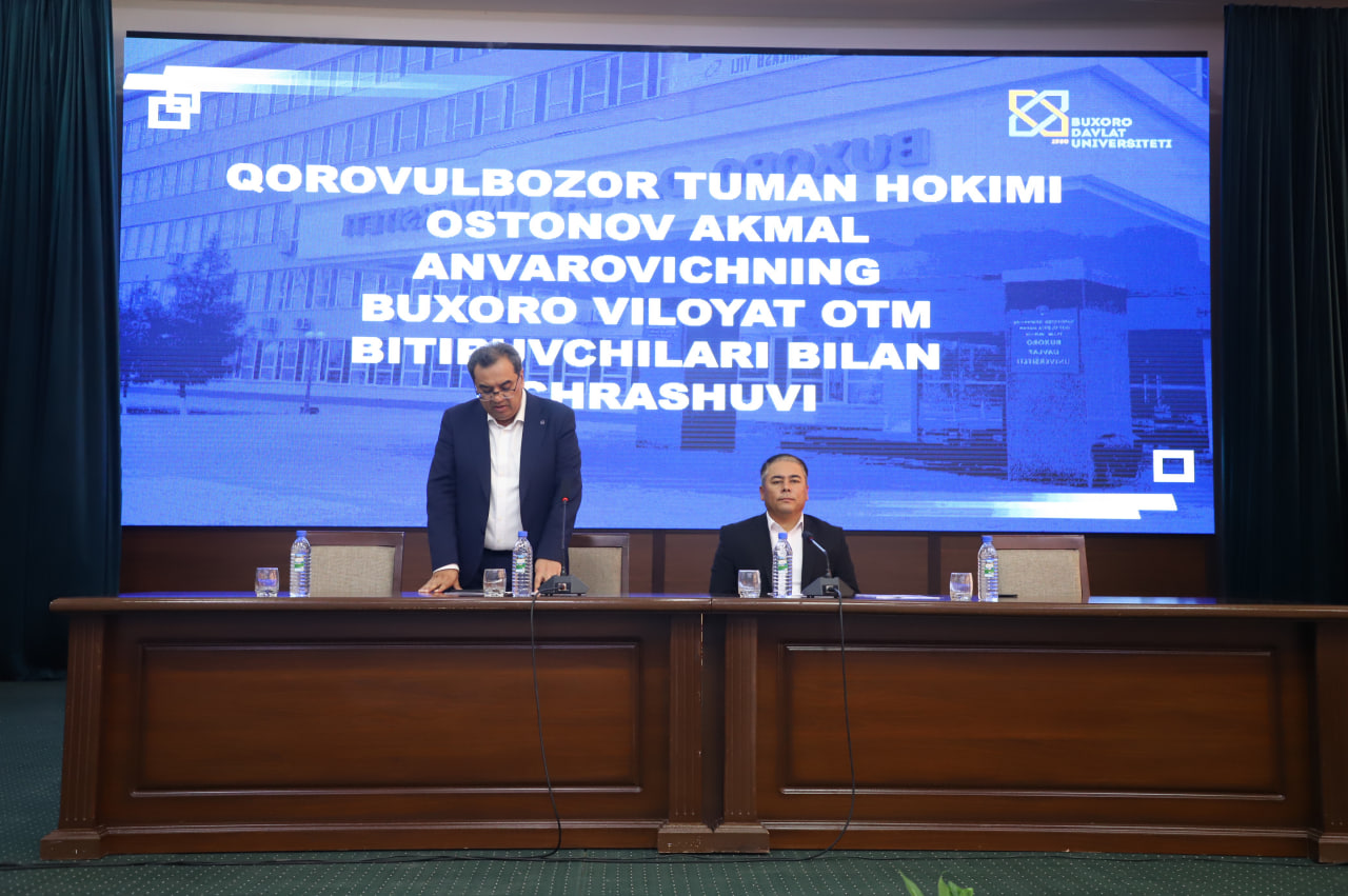 Buxoro davlat universiteti katta faollar zalida Qorovulbozor tuman hokimi Ostonov Akmal Anvarovich va Buxoro viloyat OTM bakalavr ta’lim yoʻnalishlari va magsitratura mutaxassisliklari bitiruvchilari ishtirokida “Tuman hokimi va yoshlar uchrashuvi” boʻlib oʻtdi. Tadbirda Buxoro davlat universitetidan 23 nafar, Buxoro Muhandislik texnologiyalari institutidan 2 nafar, Buxoro davlat Pedagogika institutidan 3 nafar bitiruvchi ishtirok etdi.