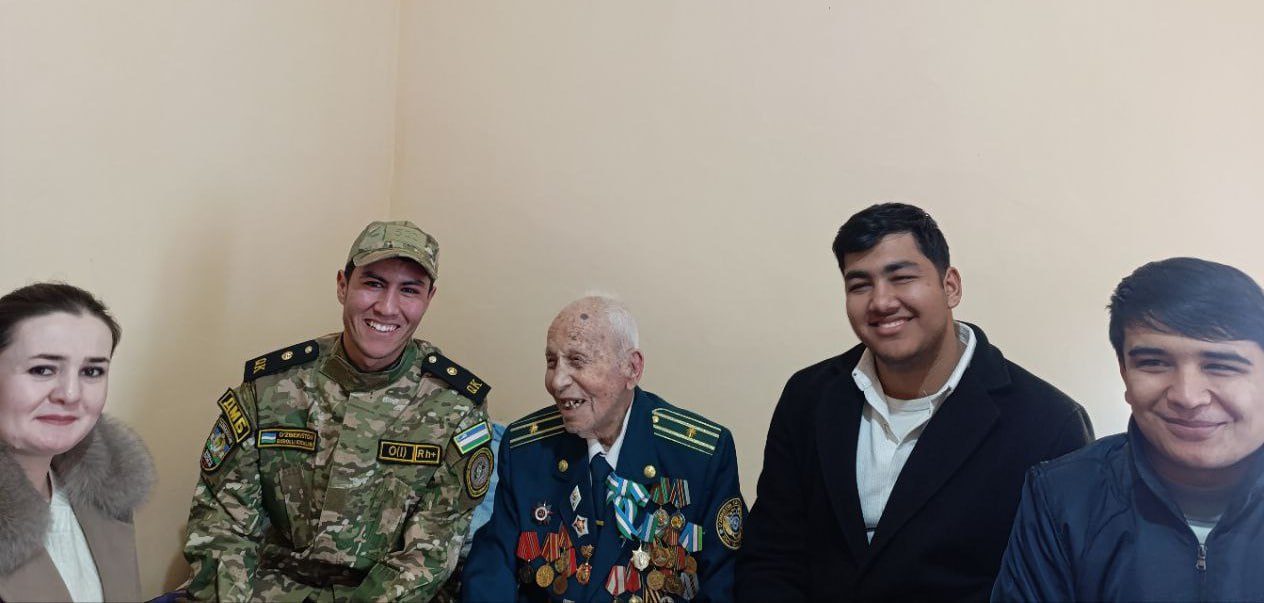 14-yanvar Vatan himoyachilari kuni munosabati bilan Iqtisodiyot va turizm fakulteti tyutori S.Rashidova 3-bosqich talabalar bilan M.Ashrafiy MFY Chashmai Ayub ko'chasi 9-uyda Istiqomat qilivchi 2-jahon urushi qatnashchisi 1924-yilda tug'ilgan Ahmad ota Muxsinov xonadonlariga tashrif buyurdi.