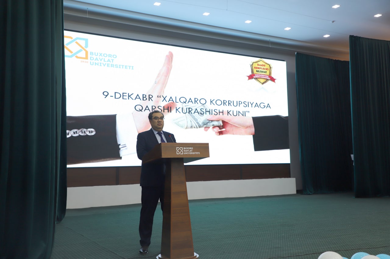Buxoro davlat universiteti boshchiligida, Buxoro viloyati prokuraturasi, Buxoro viloyati IIB, Korrupsiyaga qarshi kurashish agentligi, Buxoro viloyati hokimligi, Sud-huquq masalalari va korrupsiyaga qarshi kurashish masalalari bo`yicha doimiy komissiya a'zolari hamkorligida tashkil etilgan ushbu tadbir ko`tarinki ruhda, jonli muloqot tarzida o`tmoqda.