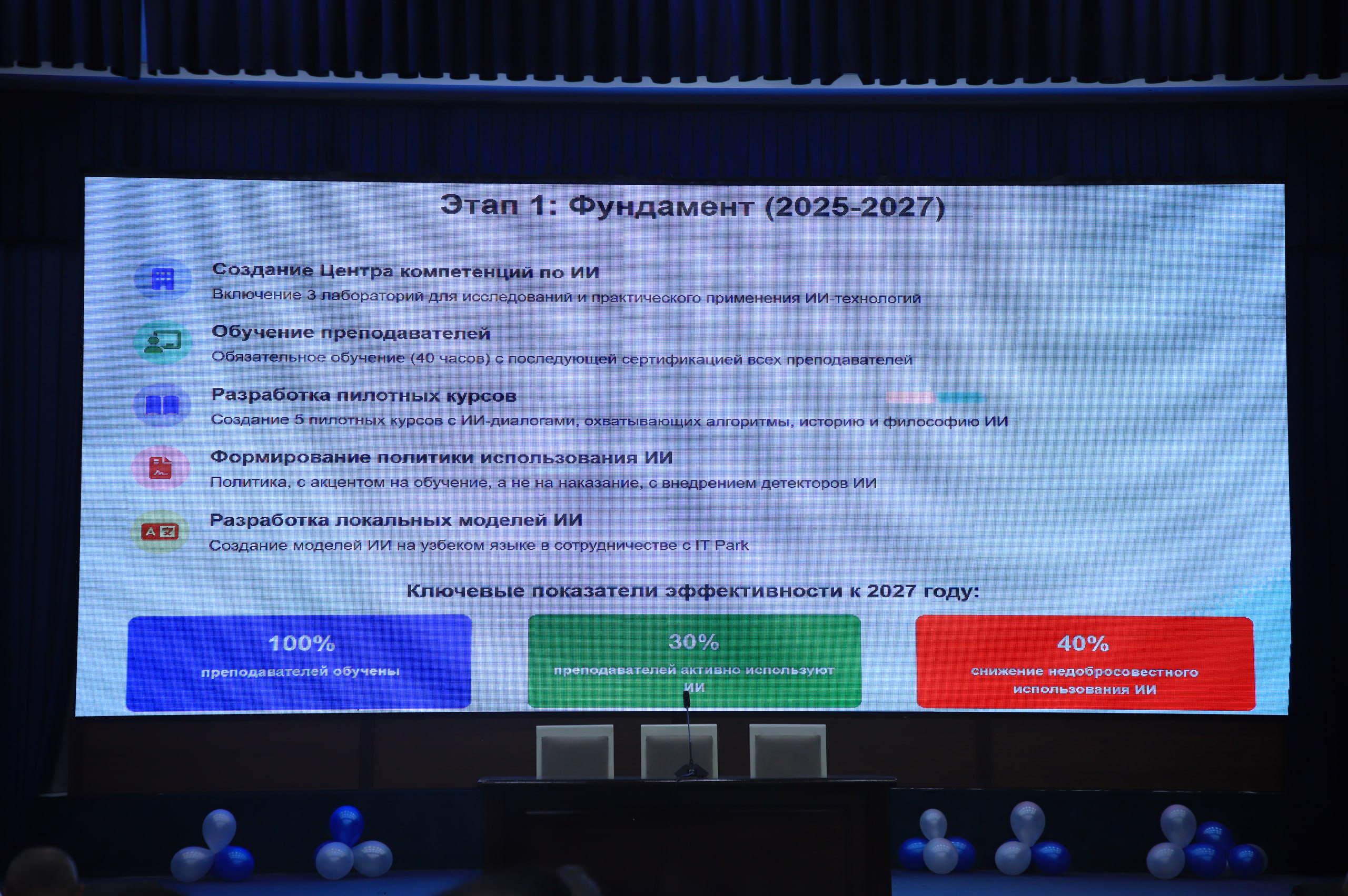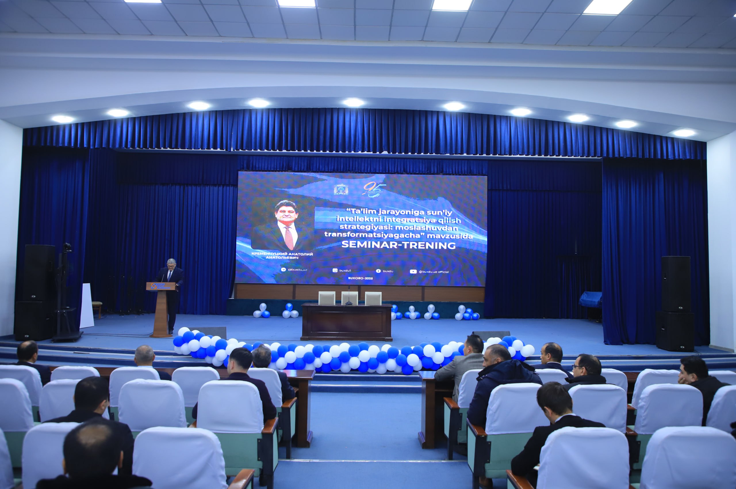 Seminar-trening davomida sun’iy intellekt texnologiyalarini ta’lim jarayoniga joriy etishning strategik yondashuvlari, o‘quv jarayonini boshqarish va monitoring qilishda AI imkoniyatlari, ta’lim sifati va samaradorligini oshirishga qaratilgan innovatsion yechimlar hamda oliy ta’lim muassasalarida raqamli transformatsiyani amalga oshirish masalalari yuzasidan atroflicha nazariy va amaliy ma’lumotlar taqdim etildi.