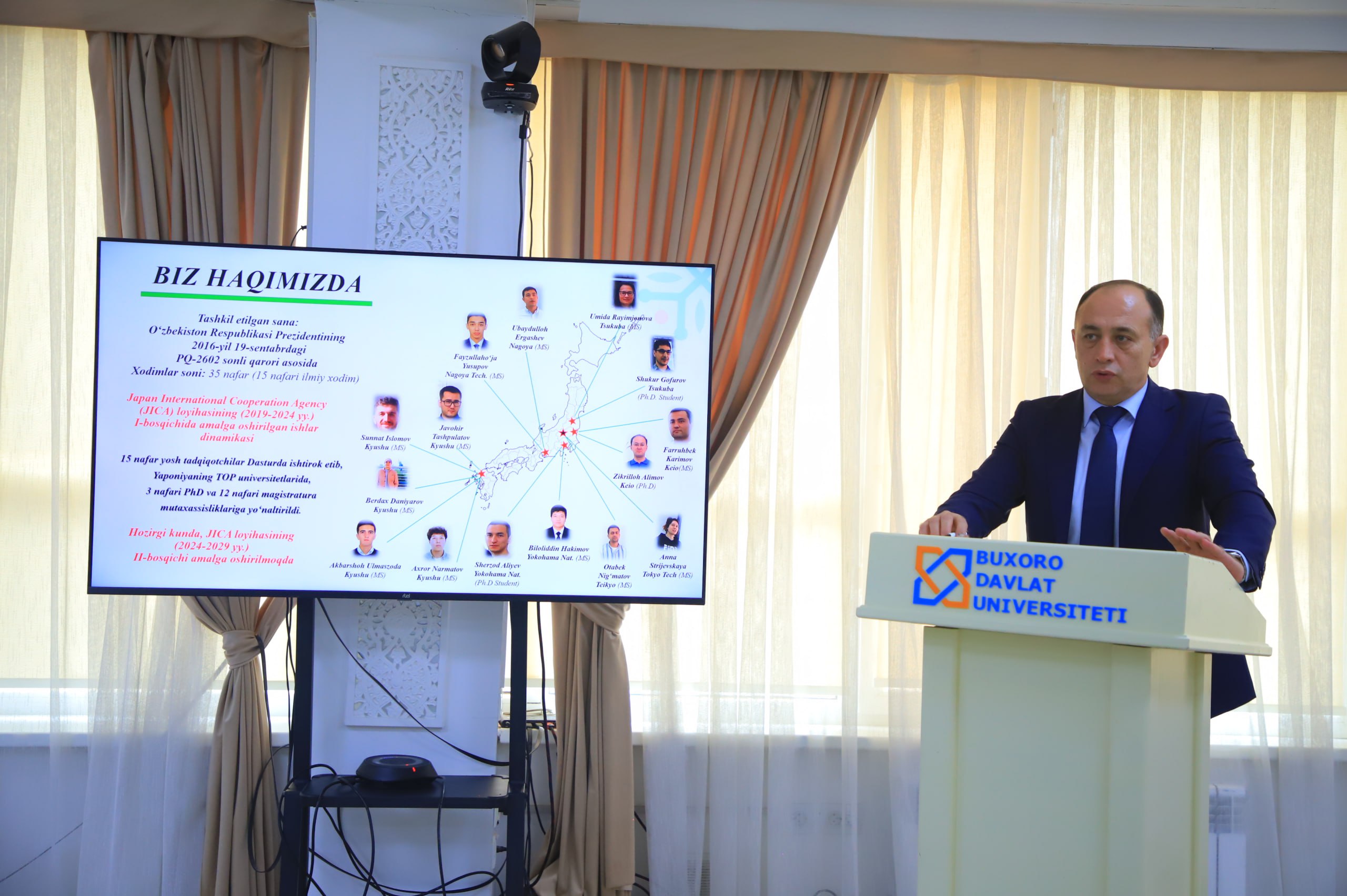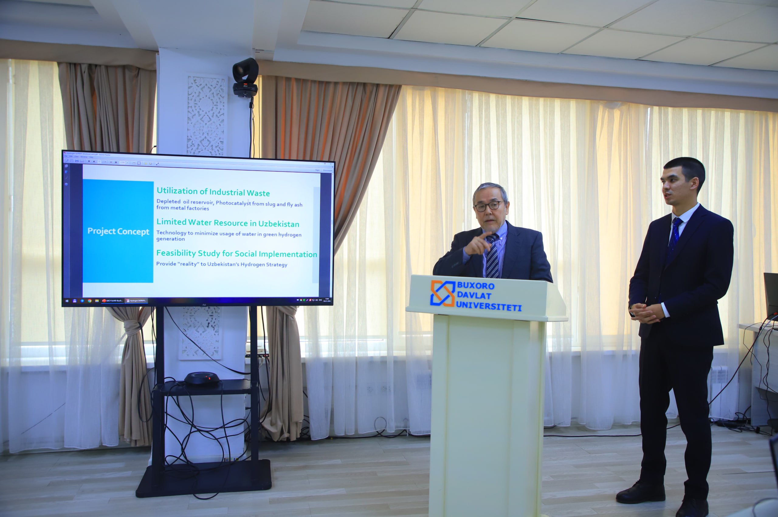 Мероприятие открыл вступительным словом проректор Бухарского государственного университета по международному сотрудничеству, кандидат экономических наук, доцент Аброр Жураев. В своем выступлении он подчеркнул растущую роль университета на международной арене и отметил, что сотрудничество с такими технологически развитыми странами, как Япония, открывает новые горизонты для молодых исследователей.