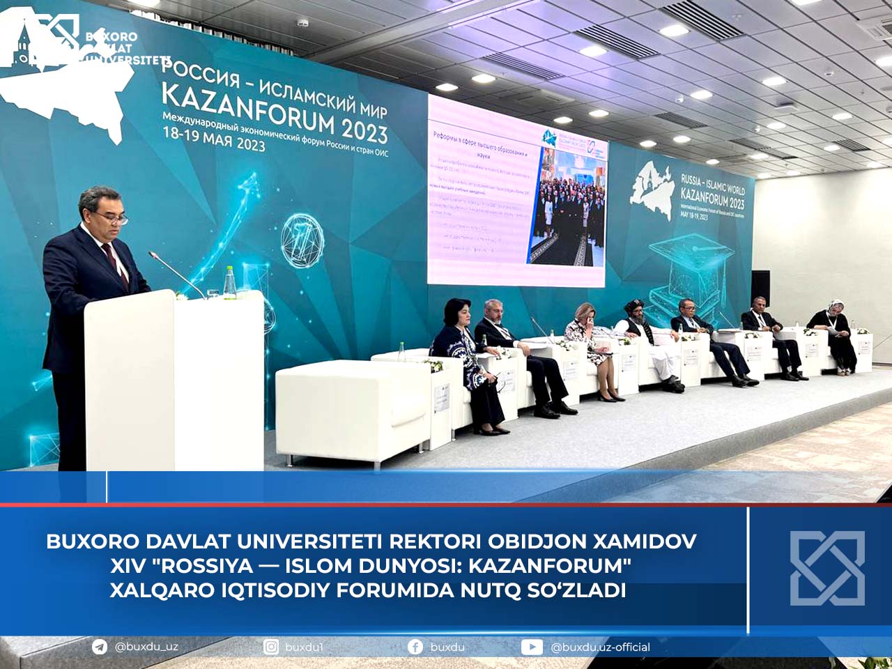 XIV "Rossiya — Islom dunyosi: Kazanforum" xalqaro iqtisodiy forumida Buxoro davlat universiteti rektori Obidjon Xamidov “O 'zbekiston Respublikasining fan va ta' lim sohasidagi xalqaro hamkorligi” mavzusida taqdimot qildi.