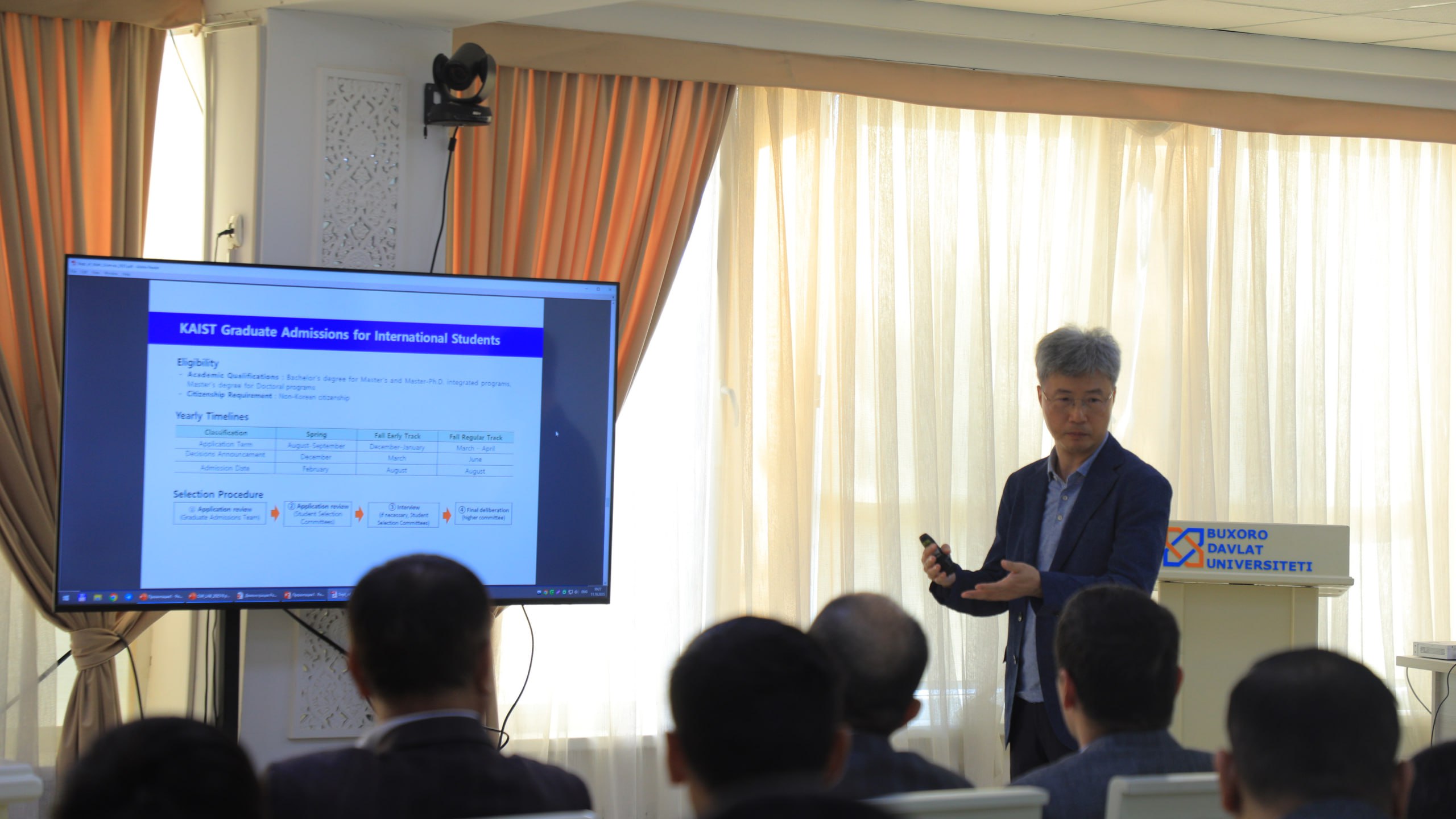 Buxoro davlat universitetida Koreya Fan va ilg‘or texnologiyalar instituti (KAIST) professorlari bilan uchrashuv doirasida “Amaliy matematika, hisoblash texnologiyalari va sun’iy intellekt” yo‘nalishlariga bag‘ishlangan ilmiy seminar o‘tkazildi. Seminar davomida KAIST professorlari Li Chang-Ok, Xvan Ganguk va Kim Dongxvan amaliy matematika, mashinali o‘qitish algoritmlari, hisoblash matematikasi va sun’iy intellekt texnologiyalarini rivojlantirishga doir o‘z tadqiqot natijalari bilan o‘rtoqlashdilar.