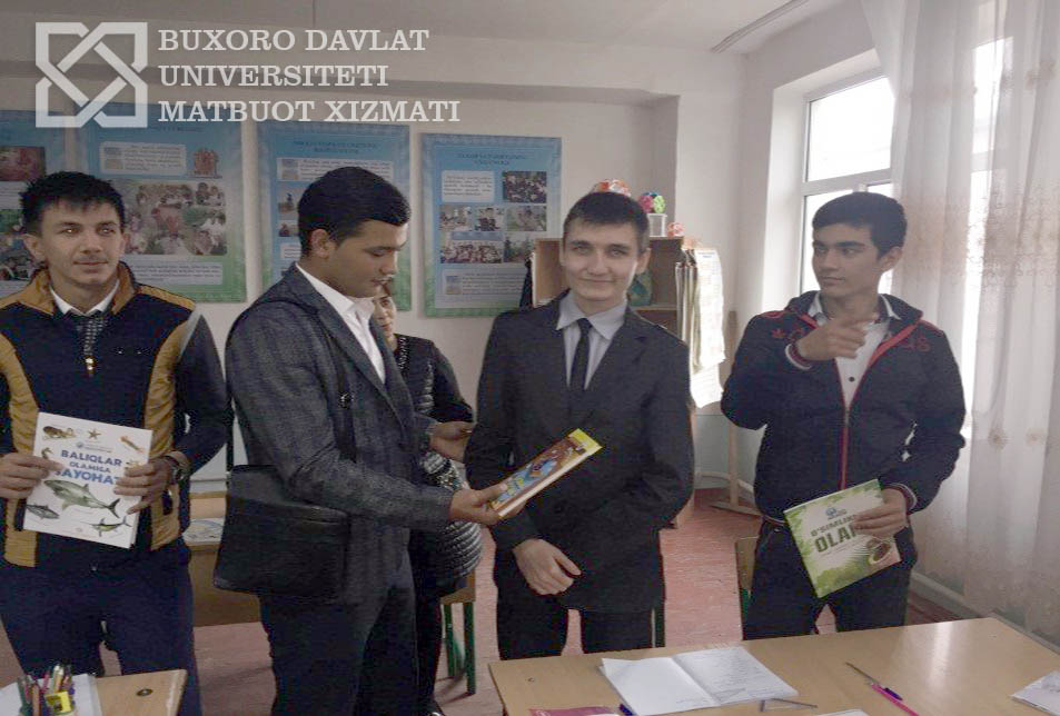 Buxoro davlat universiteti Kimyo kafedrasi 2-1KIM-18 guruhi talabalari va guruh murabbiysi F.M. Nuritdinovaning Prezidentimiz 5 ta tashabbuslari bilan Respublika kitoblar kuniga bag‘ishlab 123-Kar va zaif bolalar uchun ixtisoslashtirilgan maktab internatiga kitob tarqatish tadbiri bo`lib o`tdi.