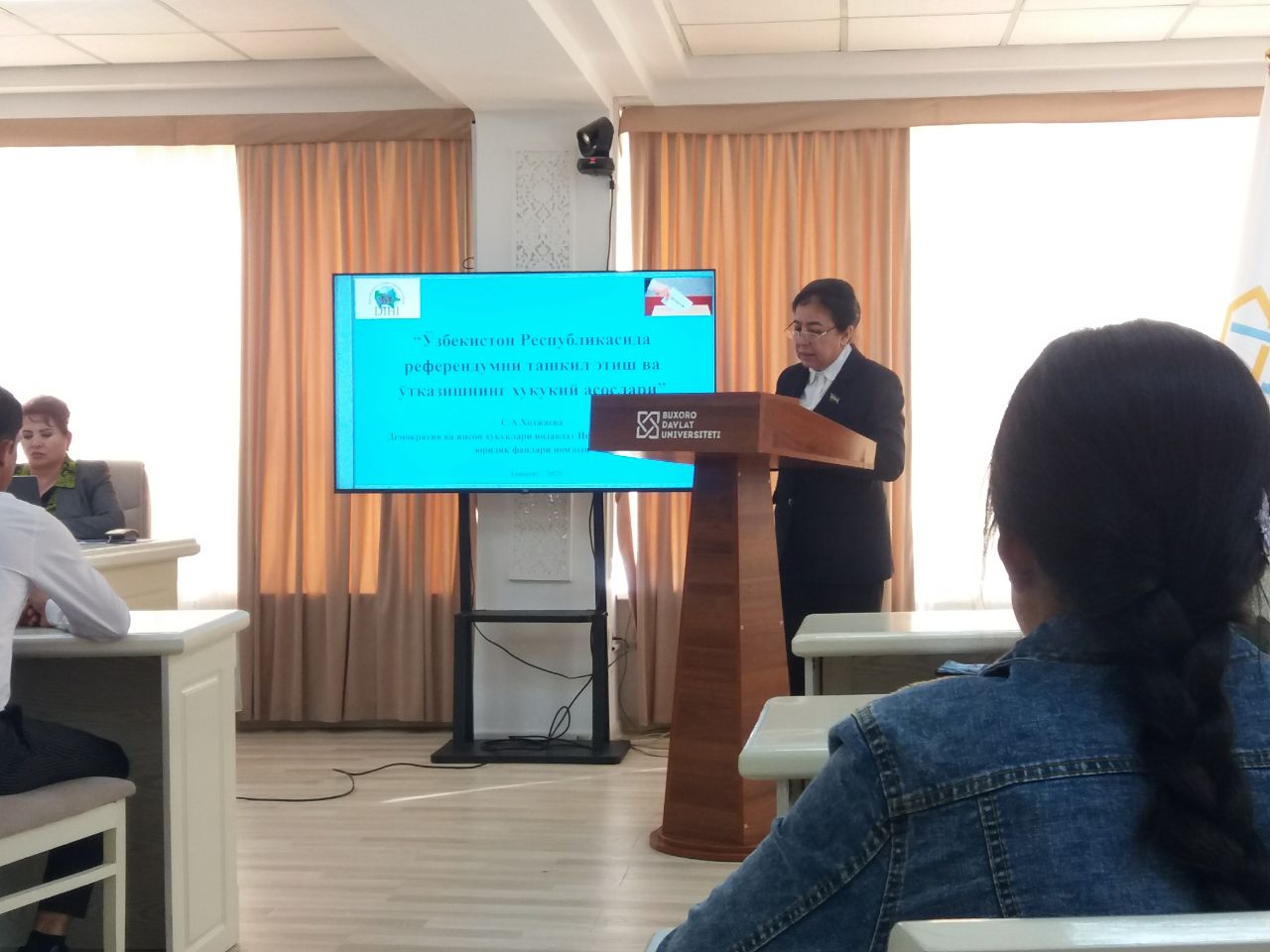 BuxDUda "О‘zbekiston Respublikasida referendumni tashkil etish va о‘tkazishning huquqiy asoslari" mavzusida ochiq muloqot tashkil qilindi. Muloqotni Demokratiya va inson huquqlari instituti direktori, yuridik fanlari nomzodi Sayyora Xodjayeva, SH.B.Umarova, Kambag‘allikni qisqartirish va bandlik vazirligi Yuridik bо‘lim boshlig‘i, Ombudsmanning Buxoro viloyatidagi mintaqaviy vakili A.A.Xuseynova mavzu yuzasidan ma’ruza qildilar va talabalarni qiziqtirgan savollarga javob berdilar. Ochiq muloqotda Tarix va yuridik fakulteti Yurisprudensiya, Siyosatshunoslik va Tarix (mamlakatlar va mintaqalar) yo’nalishi talabalari ishtiroki tyutor G.Xolova tomonidan tashkil etildi.