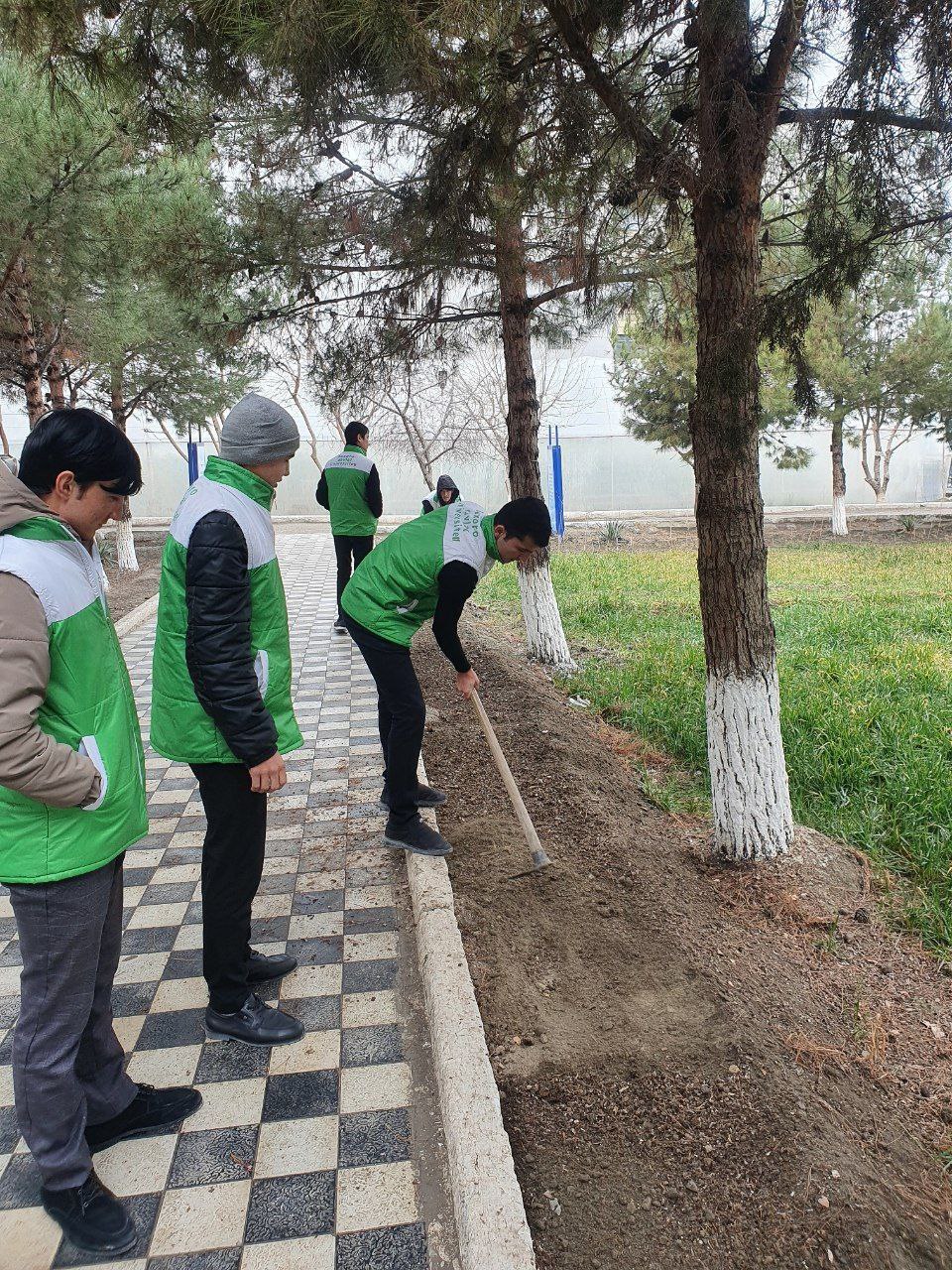 Tabiiy fanlar va agrobiotexnologiya fakultet tyutori N.Farmonov va 2-1Geo-24 2-2Geo-24 guruh talabalari bilan "Yashil makon" umummilliy harakati doirasida fakultet atrofini ko'kalamzorlashtirishga o'z hissalarini qo'shdilar. Mevali daraxtlar va gul ko'chatlari ekildi.