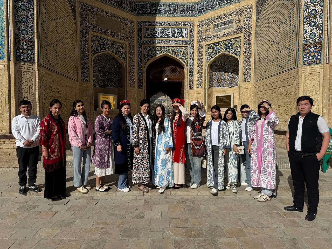 Xorijiy tillar fakulteti tyutori Samiyeva Zarina Qo'ldoshovna tomonidan 11-9ING-24 guruh talabalari bilan Buxoro shahridagi tarixiy obidalardan biri "Poyi Kalon" majmuasida "Milliy liboslar haftaligi"da chellenj tashkil etildi.