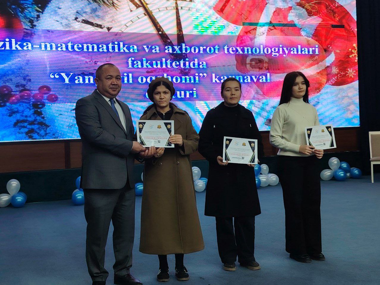 “Yangi O‘zbekiston yoshlari korrupsiyaga yo‘l qo‘ymaydi” mavzusidagi tanlovda faol ishtirok etib, o‘z bilim va iqtidorini namoyon qilgan Fizika-matematika va axborot texnologiyalari fakulteti talabalari universitet rektorining tashakkurnoma bilan taqdirla