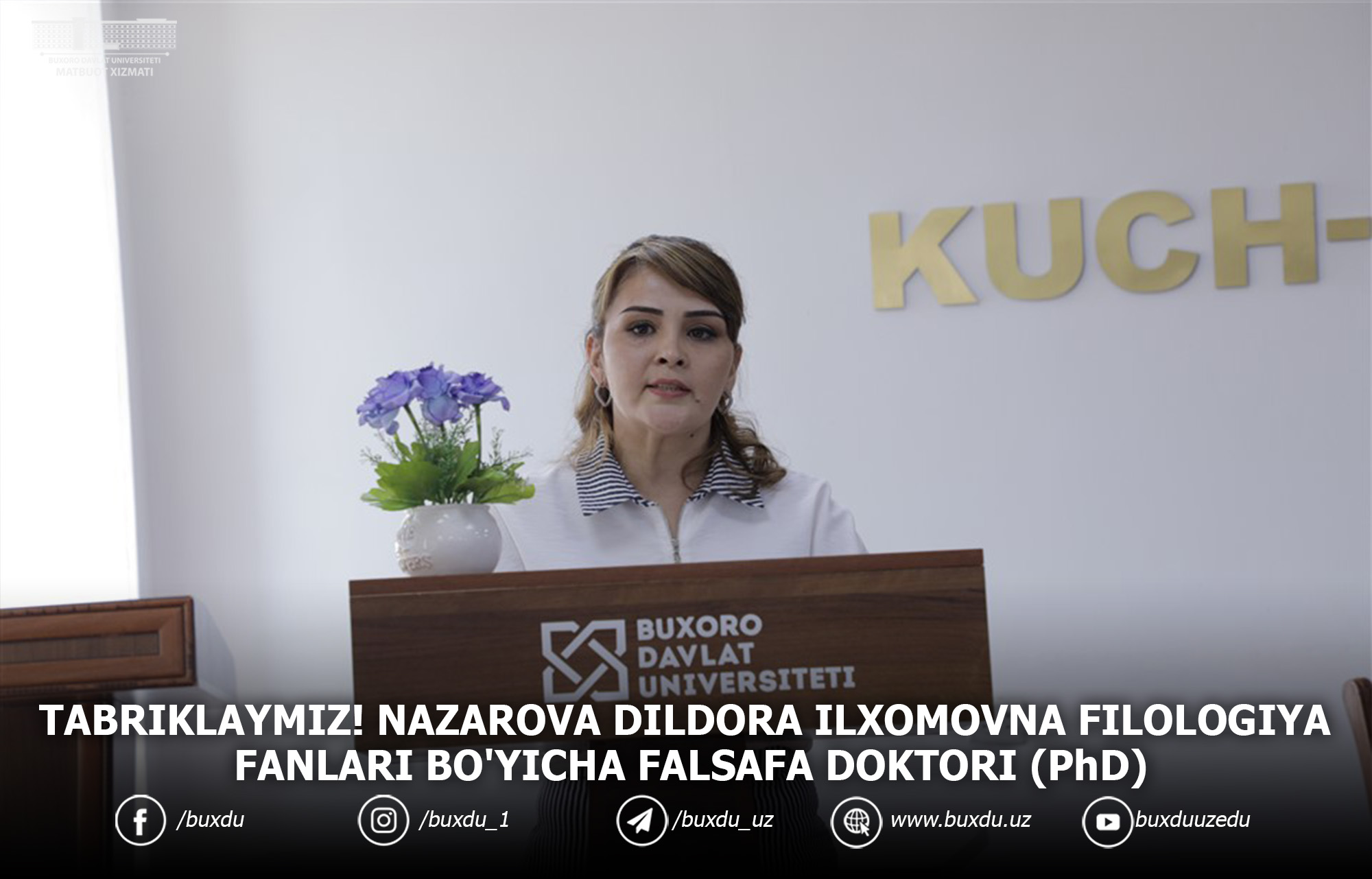 2021 yil 20-may kuni Buxoro davlat universiteti izlanuvchisi Nazarova Dildora Ilxomovnaning "Jamol Kamol she'riyati poetikasi" mavzusidagi 10.00.02 - O'zbek adabiyoti ixtisosligidagi filologiya fanlari doktori, professor Quvvatova Dilrabo Habibovna rahbarligida Buxoro davlat universiteti huzuridagi ilmiy darajalar beruvchi PhD.03/27.02.2020.FIL.72.09 raqamli ilmiy kengashda Filologiya fanlari bo’yicha falsafa doktori (PhD) dissertatsiyasini muvaffaqiyatli himoya qildilar. Jamoamiz nomidan samimiy tabriklaymiz. Keyingi ilmiy-ijodiy ishlariga barkamollik tilaymiz!BuxDU Matbuot xizmati