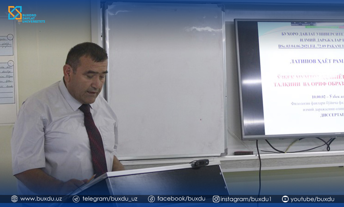 2021-yil 30-iyul kuni Buxoro davlat universiteti tayanch izlanuvchisi Latipov Hayot Ramazonovich “O`zbek mumtoz adabiyotida ma`rifat talqini va orif obrazi (XIII – XV asrlar)” mavzusida 10.00.02 – O`zbek adabiyoti ixtisosligidagi Buxoro davlat universiteti huzuridagi ilmiy darajalar beruvchi DSc.03/04.06.2021.Fil.72.09 raqamli Ilmiy kengashda filologiya fanlari bo`yicha falsafa doktori (PhD) dissertatsiyasini muvaffaqiyatli himoya qildilar.Jamoamiz nomidan samimiy tabriklaymiz. Keyingi ilmiy-ijodiy ishlariga barkamollik tilaymiz!BuxDU Matbuot xizmati