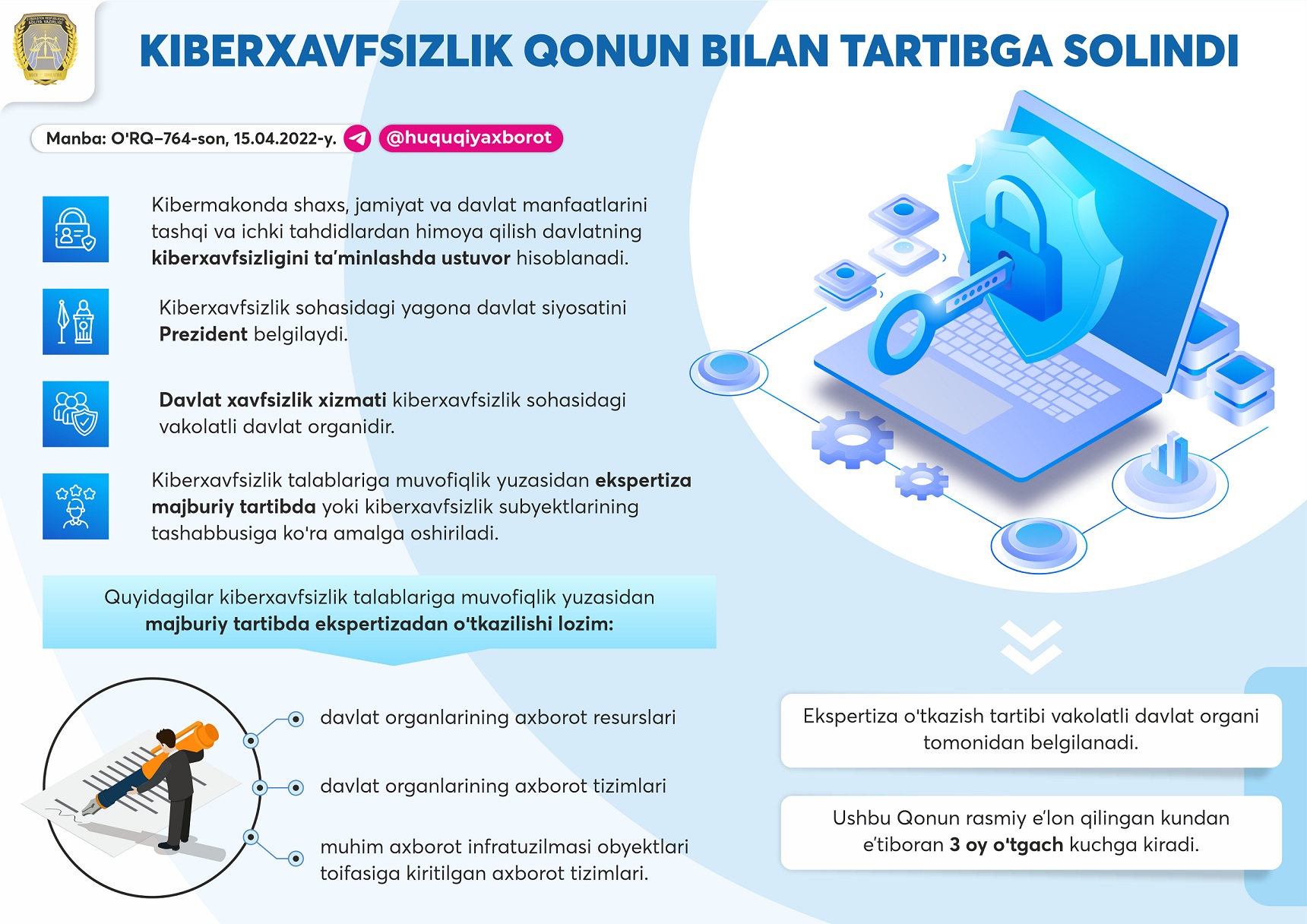 “Kiberxavfsizlik toʻgʻrisida”gi Qonun (OʻRQ–764-son, 15.04.2022-y.) Prezident tomonidan imzolandi.