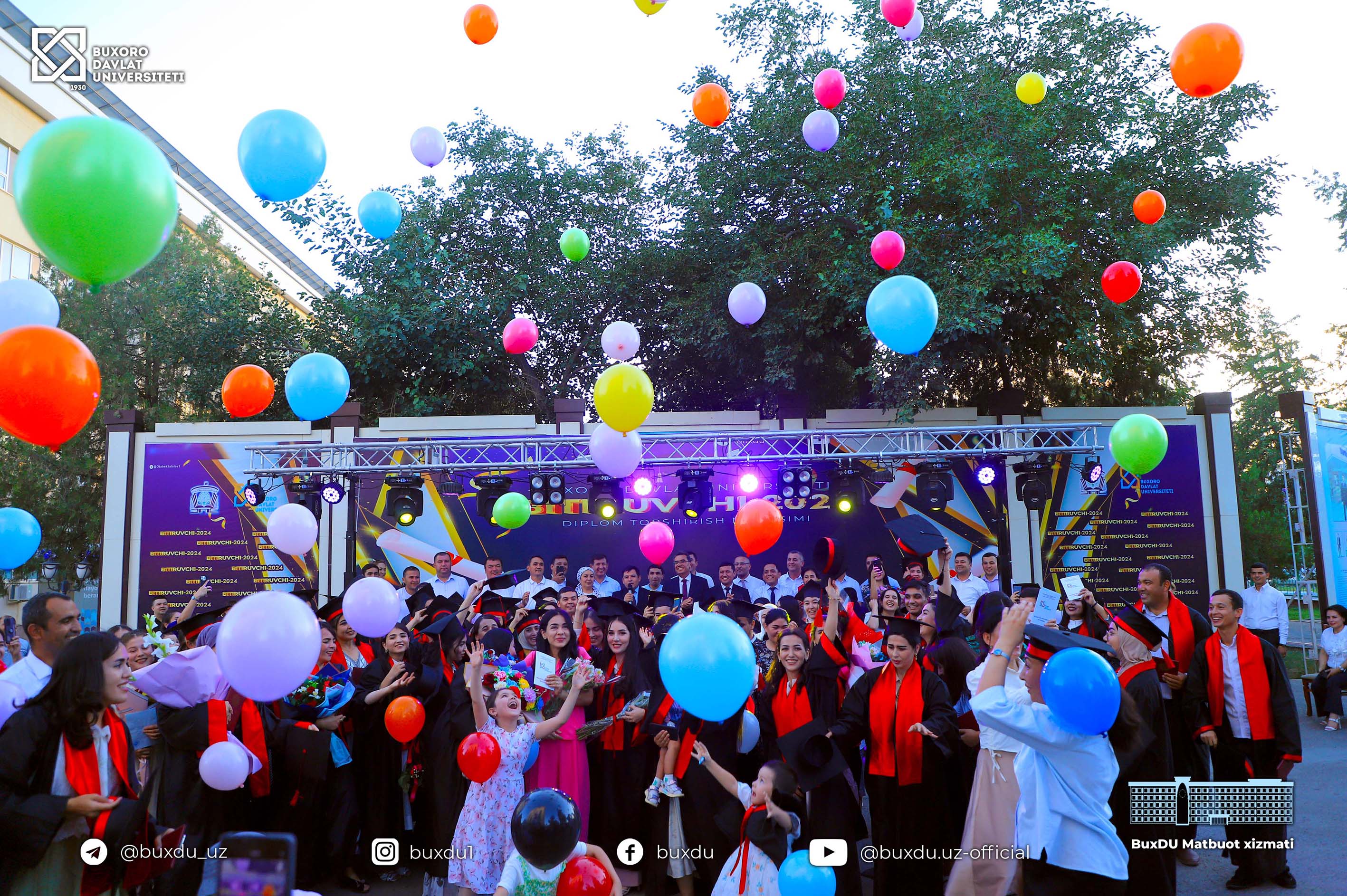 Har yilgi an’anaga muvofiq kecha ham BuxDU bakalavr va magistrlarni mustaqil ilm yo‘liga kuzatish uchun tantanali tadbir tashkil etildi. Ushbu tadbirni kirish so‘zi bilan Buxoro davlat universiteti rektori, iqtisodiyot fanlari doktori, professor Obidjon Xamidov ochib berdi. Shuningdek, tadbir davomida universitetimizning bitiruvchilari, sobiq O‘zbekiston Respublikasi Tashqi ishlar vaziri, Shanxay hamkorlik tashkiloti sobiq bosh kotibi, Buxoro davlat universiteti Kuzatuv Kengashi a’zosi Vladimir Norov, “O‘zbekiston Qahramoni” unvoni sohibi Muhammadjon Ahmedovlar bitiruvchi talabalarga o’z tilaklarini yo’llashdi. Shuningdek, bitiruv kechasida Oliy ta’lim, fan va innovatsiyalar vazirligi Buxoro viloyati hududiy boshqarma boshlig‘i Azamat Naimov, Buxoro viloyati prokuraturasi ijtimoiy sohada qonunchilik ijrosi ustidan nazorat bo‘limi boshlig‘i Xalikov Aziz, Buxoro davlat tibbiyot instituti rektori Shuhrat Teshayev, Respublika ma'naviyat va ma'rifat markazi Buxoro viloyati bo'limi boshlig'i Marhabo Pardayeva, Turizm va sport bosh boshqarmasi boshlig'i o'rinbosari Suhrob Bobokalonov, viloyat tashkilotlari rahbarlari ishtirok etishdi.