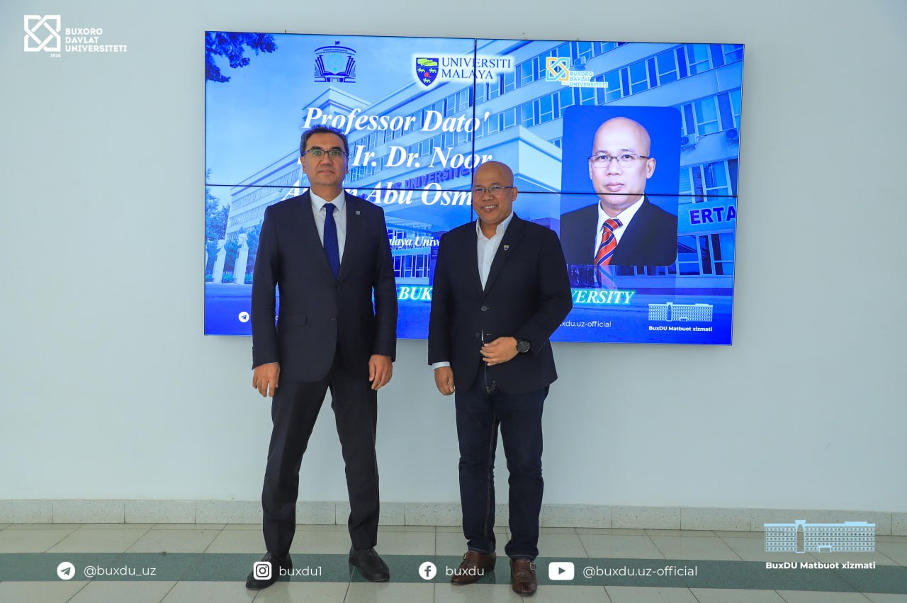 Buxoro davlat universiteti faoliyati bilan yaqindan tanishish maqsadida Malayziyaning Malaya universiteti rektori Dato' Seri Ir. Dr. Noor Azuan Bin Abu Osman universitetimizda bo`ldi. Mehmonni universitetimiz rektori Obidjon Xafizovich hamda universitet rahbariyati kutib olishdi. Professor Dato' Seri Ir. Dr. Noor Azuan Bin Abu Osman universitetlararo hamkorlik aloqalarini kuchaytirish maqsadida universitetimiz imkoniyatlari bilan tanishdi.